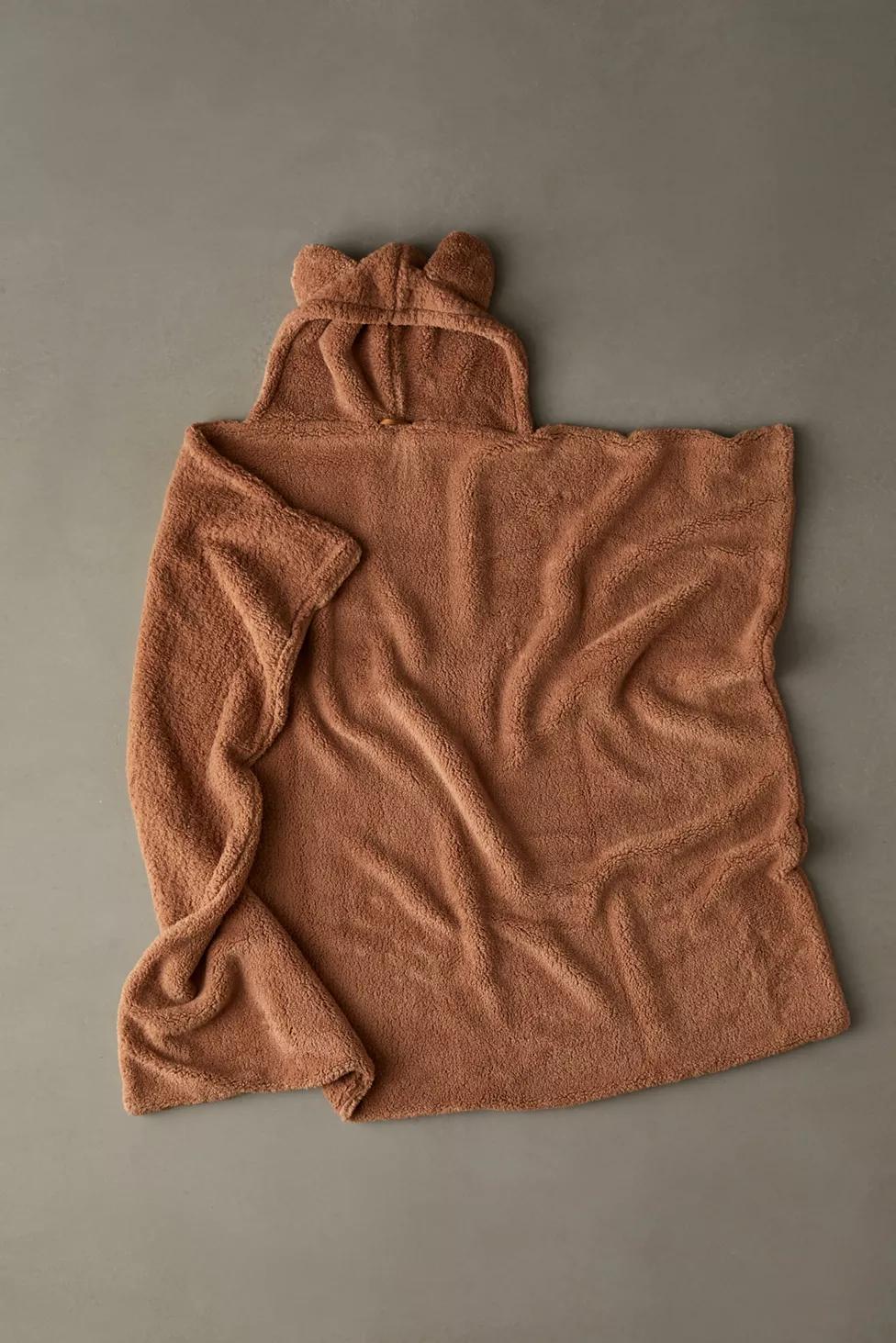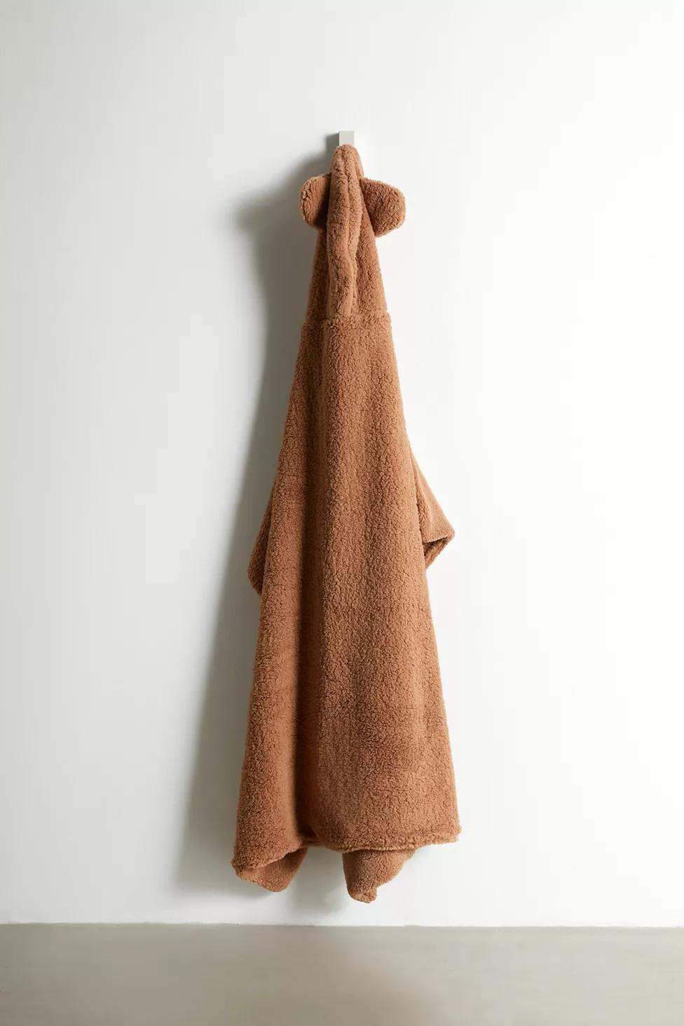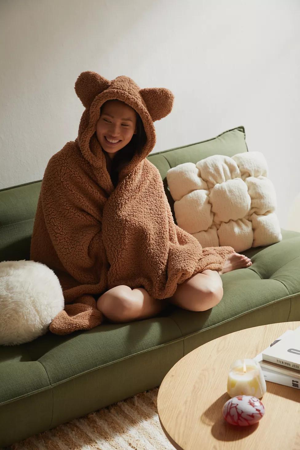 You can always experience the warmth of a bear hug when you curl up in this plush fleece throw blanket featuring a hooded silhouette with itty bitty animal ears at the top. Available exclusively at Urban Outfitters.