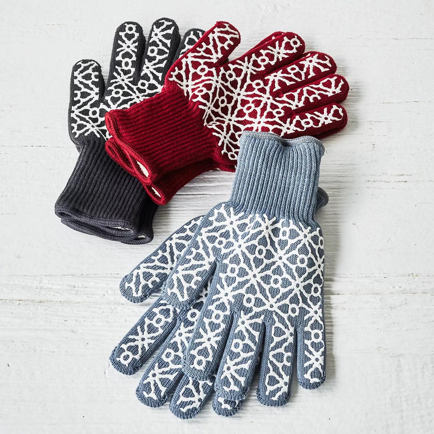 The ultimate way to stay safe, work quickly and look good while cooking. These heat-resistant gloves protect your hands from searing oven temperatures without limiting dexterity like standard mitts, and the long, heat-resistant cuffs help protect your wrists and forearms. The thick, aramid-and-cotton construction is designed to withstand intense heat when handling hot pots and pans too—even holding a kettle of boiling water from the base.