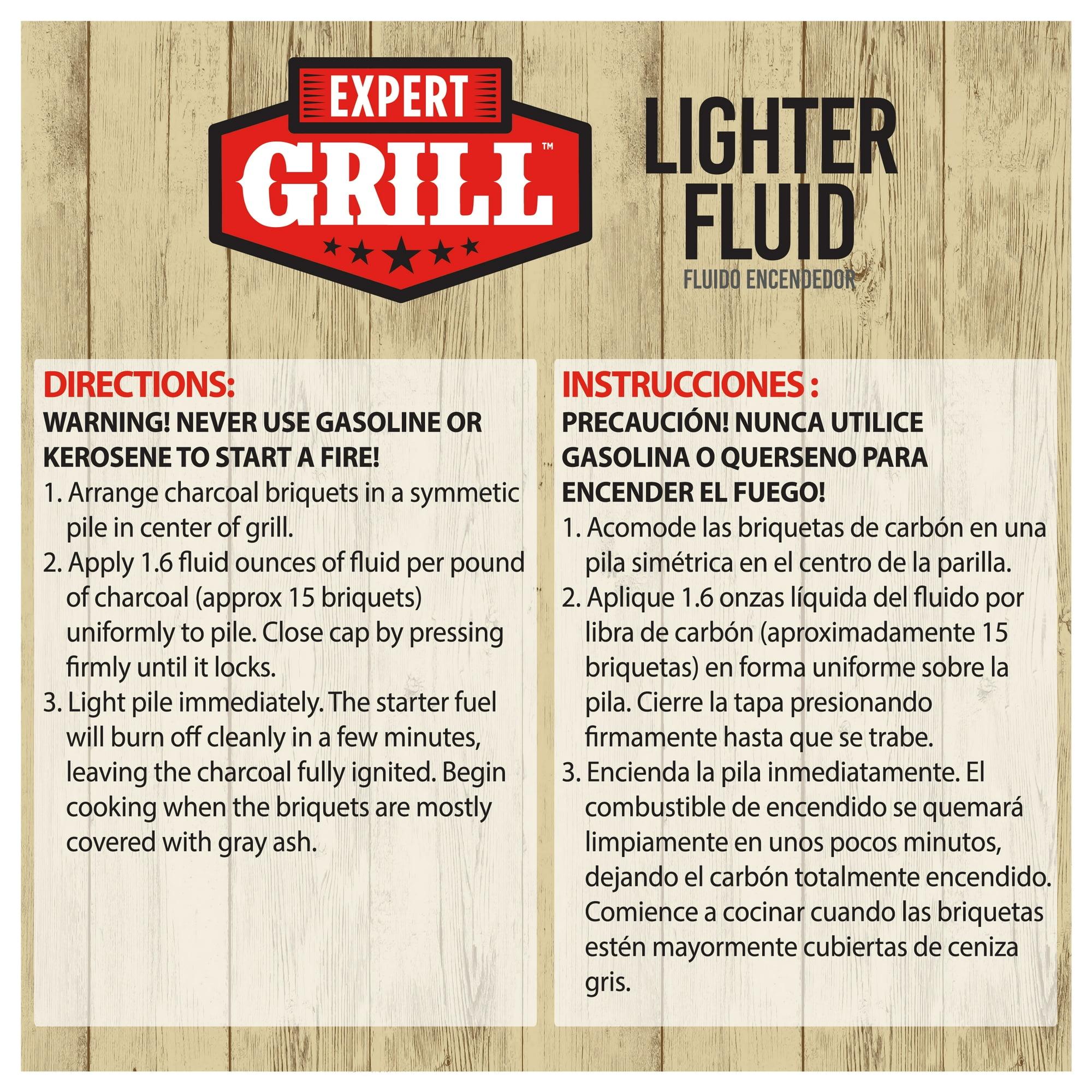 Expert Grill Charcoal Lighter Fluid, Charcoal Starter, 32 Oz Lighter fluid for grill Odorless fluid with easy-pour spout for convenience and less mess Double-filtered and meets all environmental requirements Fast-lighting lighter fluid For best results, start your fire 15 minutes before cooking Use with Expert Grill Charcoal or any traditional charcoal