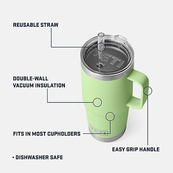 Grip it and sip it with this supremely insulated mug. With an elevated handle and cup holder-compatible design, it's built for easy water hydration, iced caffeine commutes, and any adventure you can throw at it. It's topped with the YETI fan-favorite Straw Lid, so you can say goodbye to single-use plastic straws. And when the day is finally done, toss both the mug and lid in the dishwasher to prep for the next day's nonstop use. YETI Rambler Straw Lids are built to last and have a molded-in stopper that holds your straw safely in place. And just like all YETI Rambler Lids, it's shatter-resistant, dishwasher-safe, and BPA free. Do not use the Rambler Tumbler Straw Lid with hot beverages. 18/8 STAINLESS STEEL Resists dents and drops. DOUBLE-WALL VACUUM INSULATION keeps drinks cold to the last drop. DISHWASHER SAFE Because no one needs more work to do. NO SWEAT DESIGN prevents condensation, keeping hands dry. CUP-HOLDER COMPATIBLE