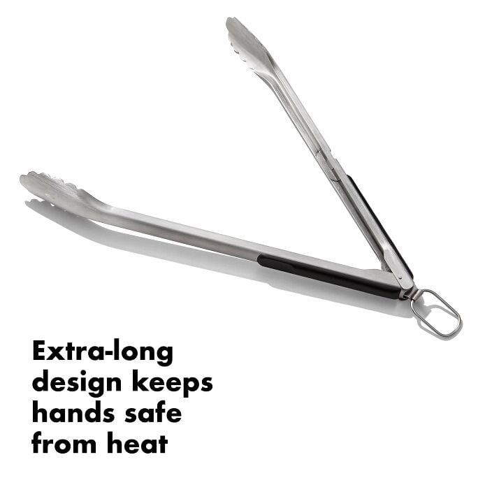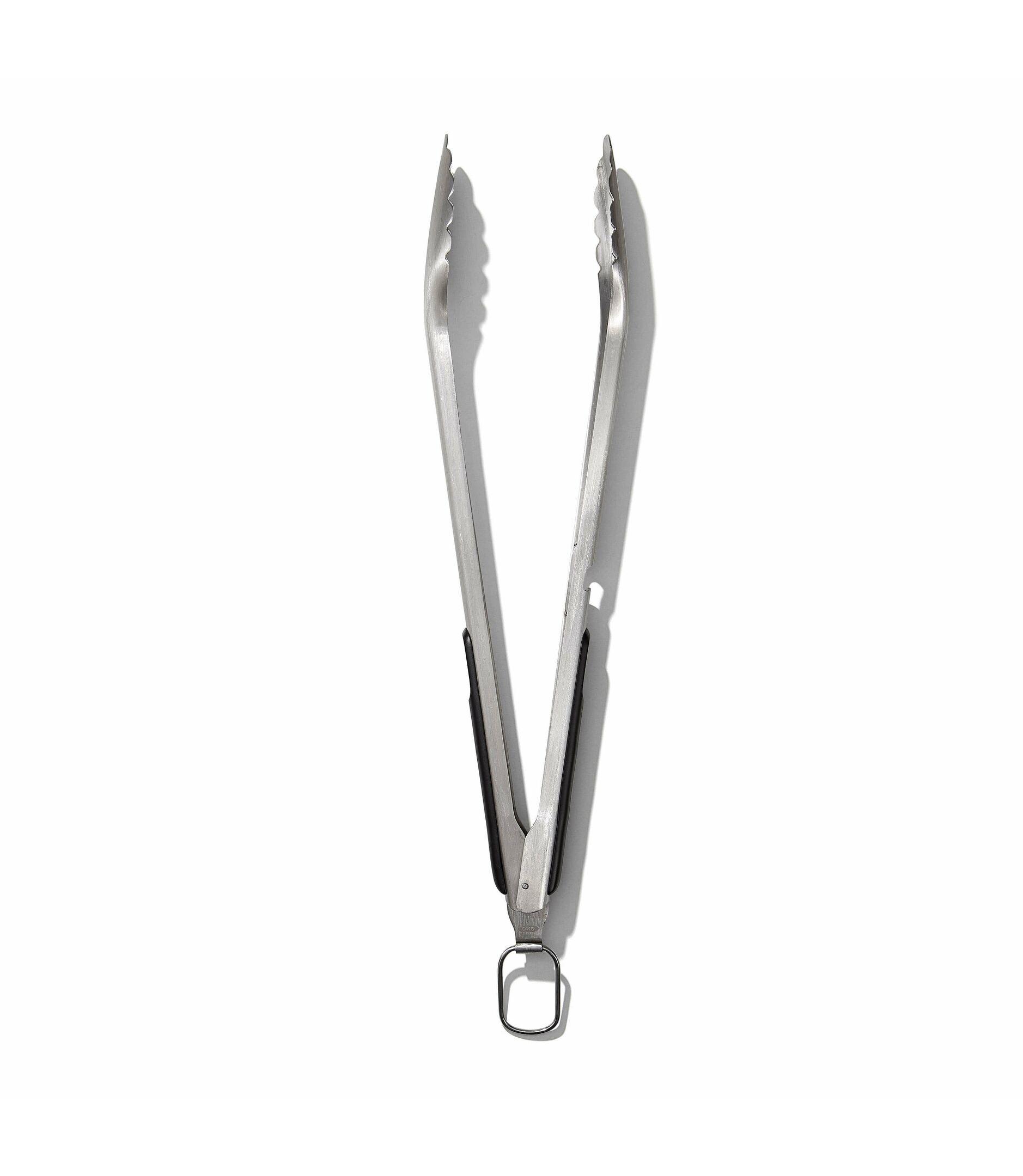 With heavy-duty stainless steel construction and a smart, scalloped head design, the OXO Good Grips Grilling Tongs with Built-In Bottle Opener are sure to be your grilling go-tos. Angled heads grab and hold onto everything from thick cuts of meat to corn on the cob for fumble-free flipping, turning, and transferring. The handle has a built-in bottle opener for ultimate convenience and an extra-long design to keep hands safely away from heat. Pull the ring to lock the Tongs closed and hang right by the grill for storage. Dishwasher safe.