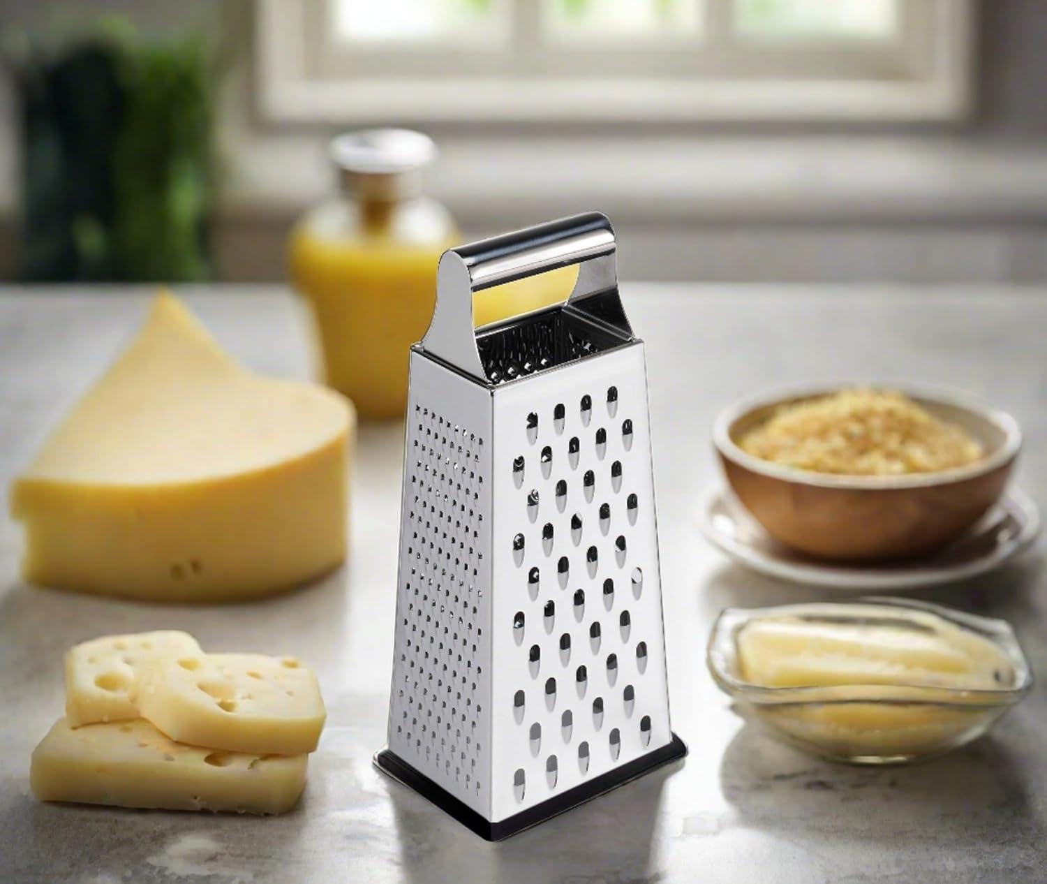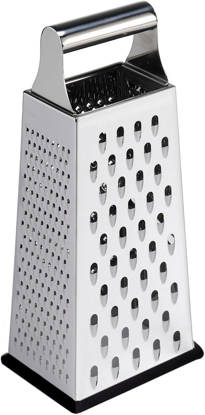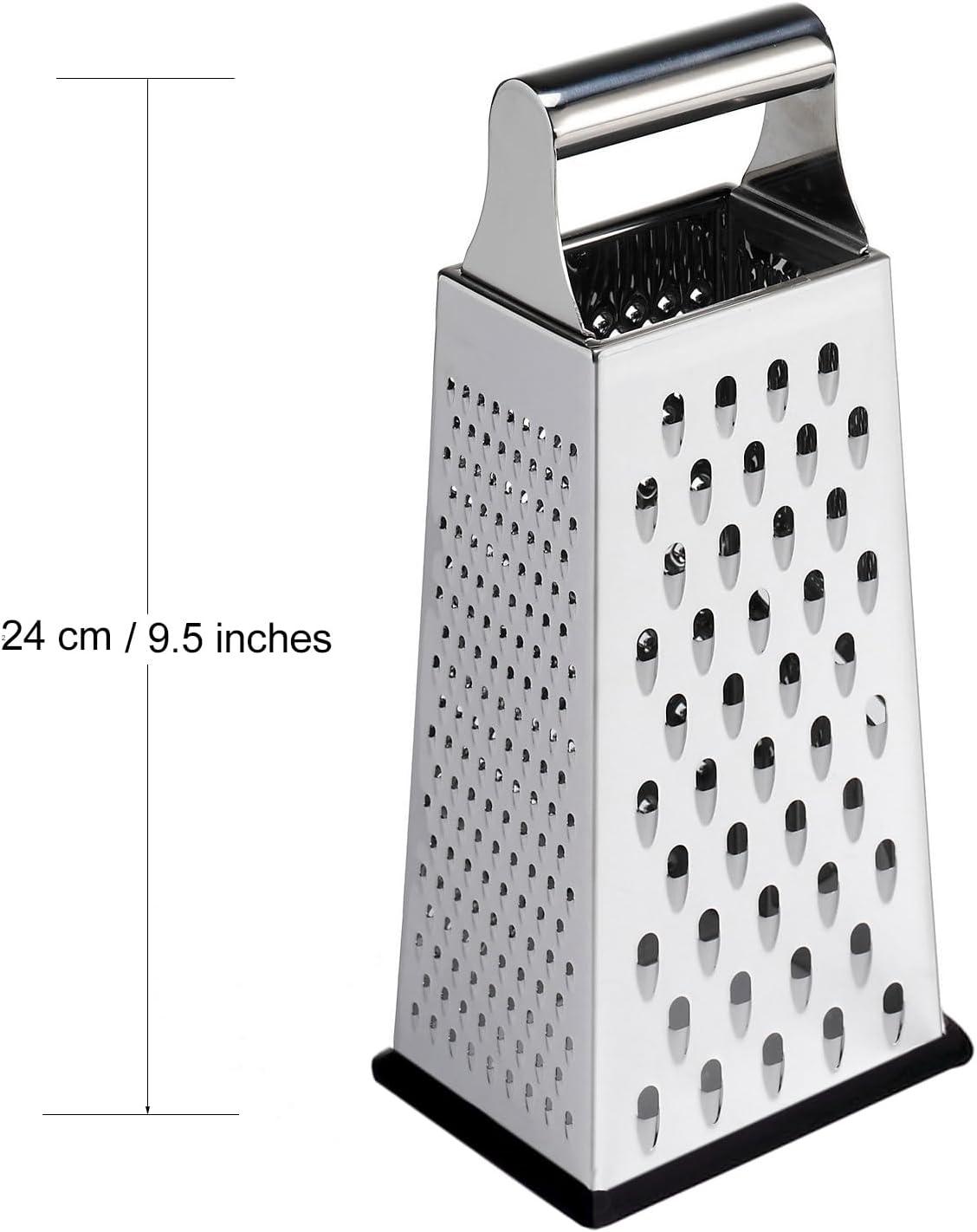 9.5" Stainless Steel Box Grater has a handle and 4 Grating Grater has non-skid base to help you safely grate cheese and vegetables. Box design holds shredded ingredients until you're ready to use them. Disclosure: We are a participant in the Amazon Services LLC Associates Program, an affiliate advertising program designed to provide a means for us to earn fees by linking to Amazon.com and Affiliate sites.