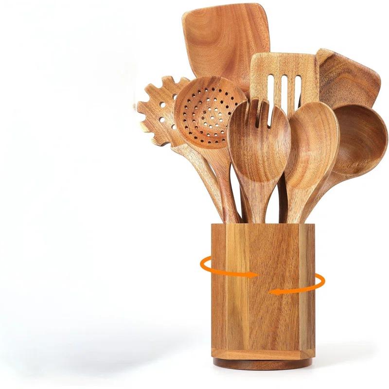 Utensil Cooking Spoon Set With Holder 9 Pcs Wooden Spoons
