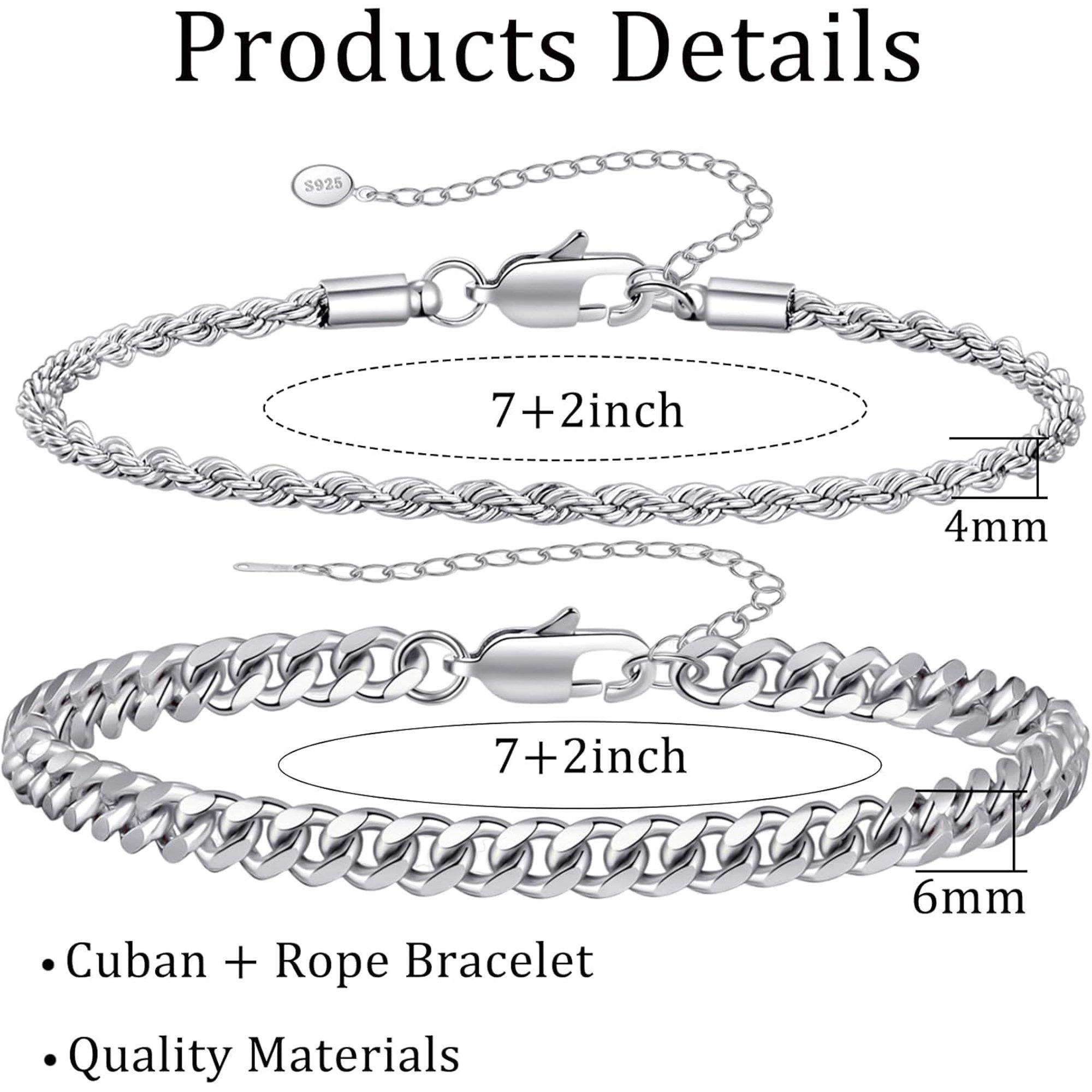 2 Pcs Chain Bracelet for Men - 925 Sterling Silver Bracelet for Men 7-9inch Figaro Rope Cuban Link Bracelet Set for Men to Men Dad Husband Silver-1217