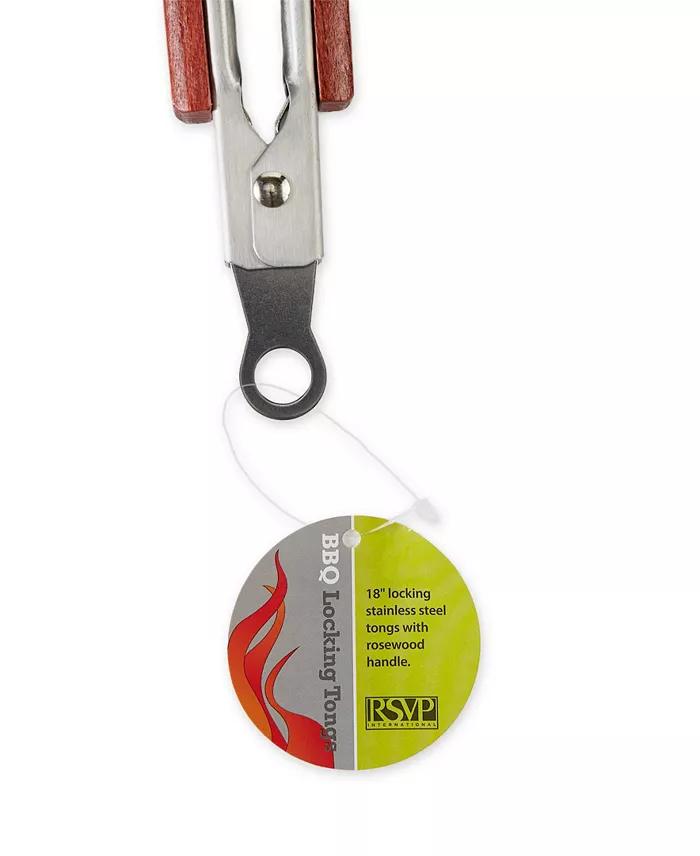 Dimensions: 19 x 1.75 x 1.75 Extra long handles keep your hands away from the fire No Warranty Set pieces/Capacity of each item - 1 Our long, locking tongs will make your grilling experience so much easier. Hanging hook on handle provides a convenient storage option Stainless Steel, Rosewood, Aluminum Spot clean only