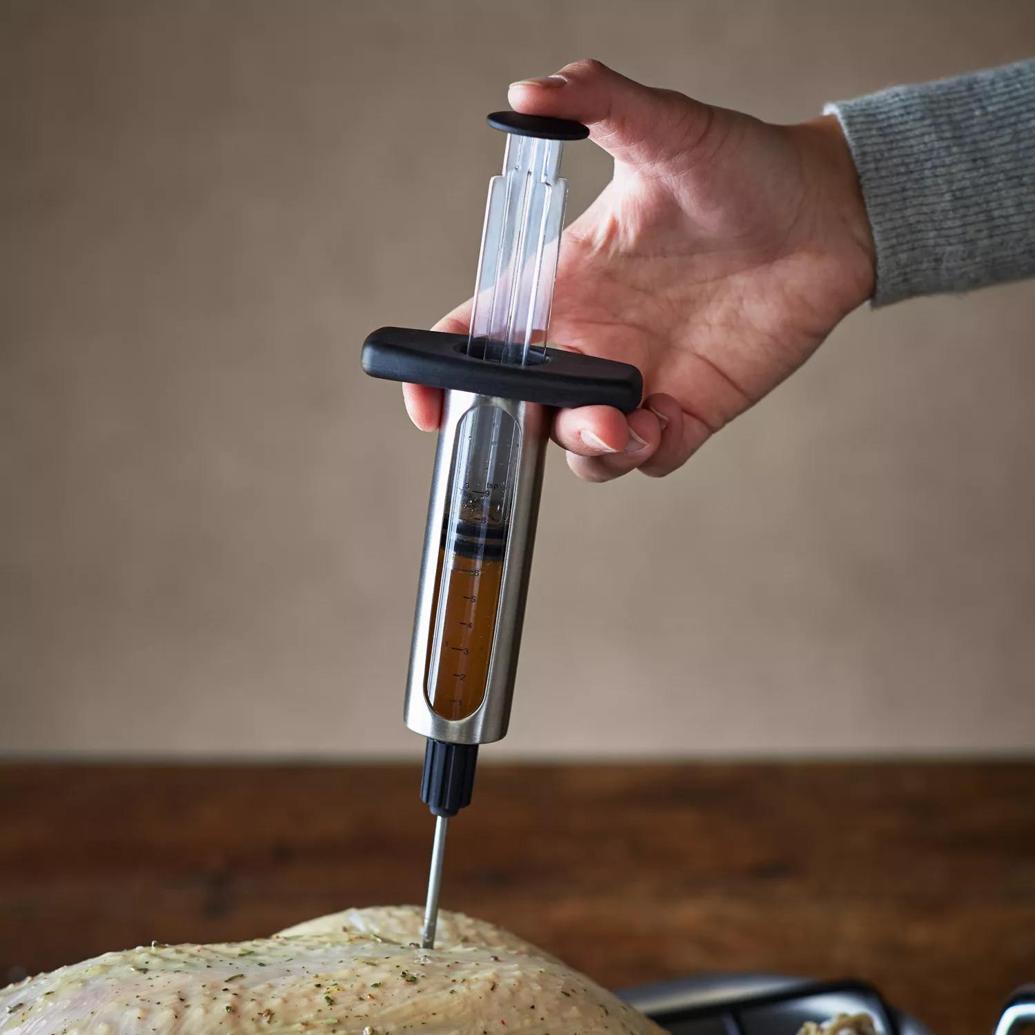 Great for roasting, barbequing, deep frying and more—our flavor injector bastes meat and poultry from the inside out Inject the flavor mixture of your choice for exceptional moisture and tenderness Clear window features easy-to-read measurement markings Durable 18/10 stainless steel and plastic injector cleans up easily in the dishwasher
